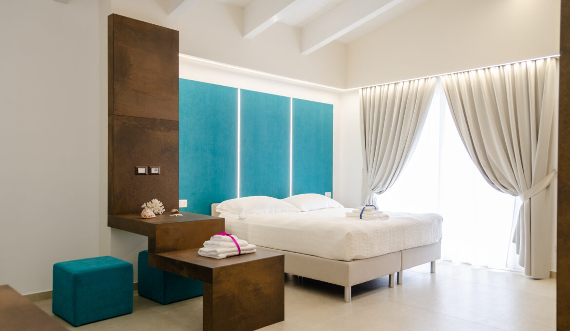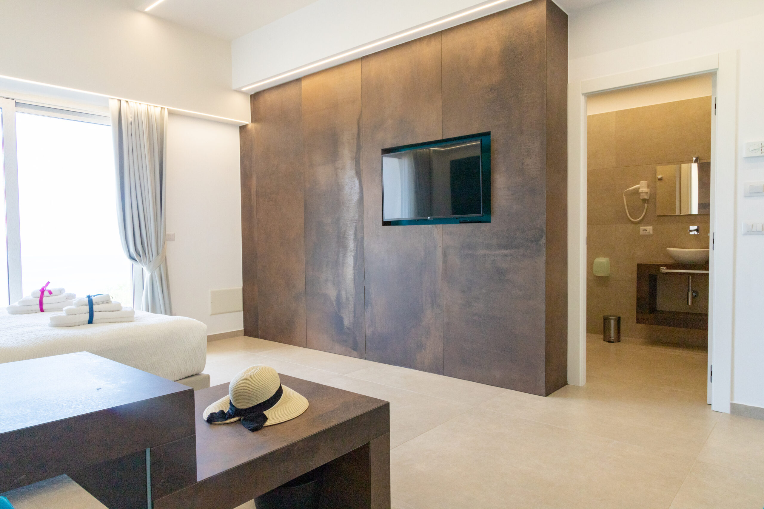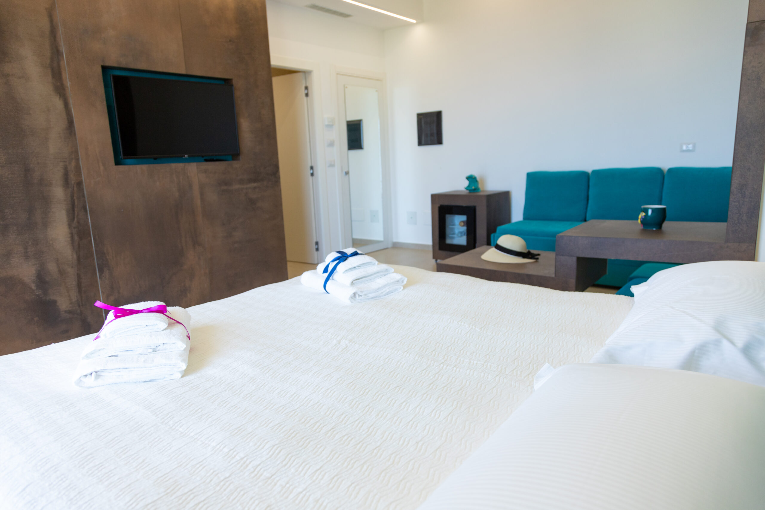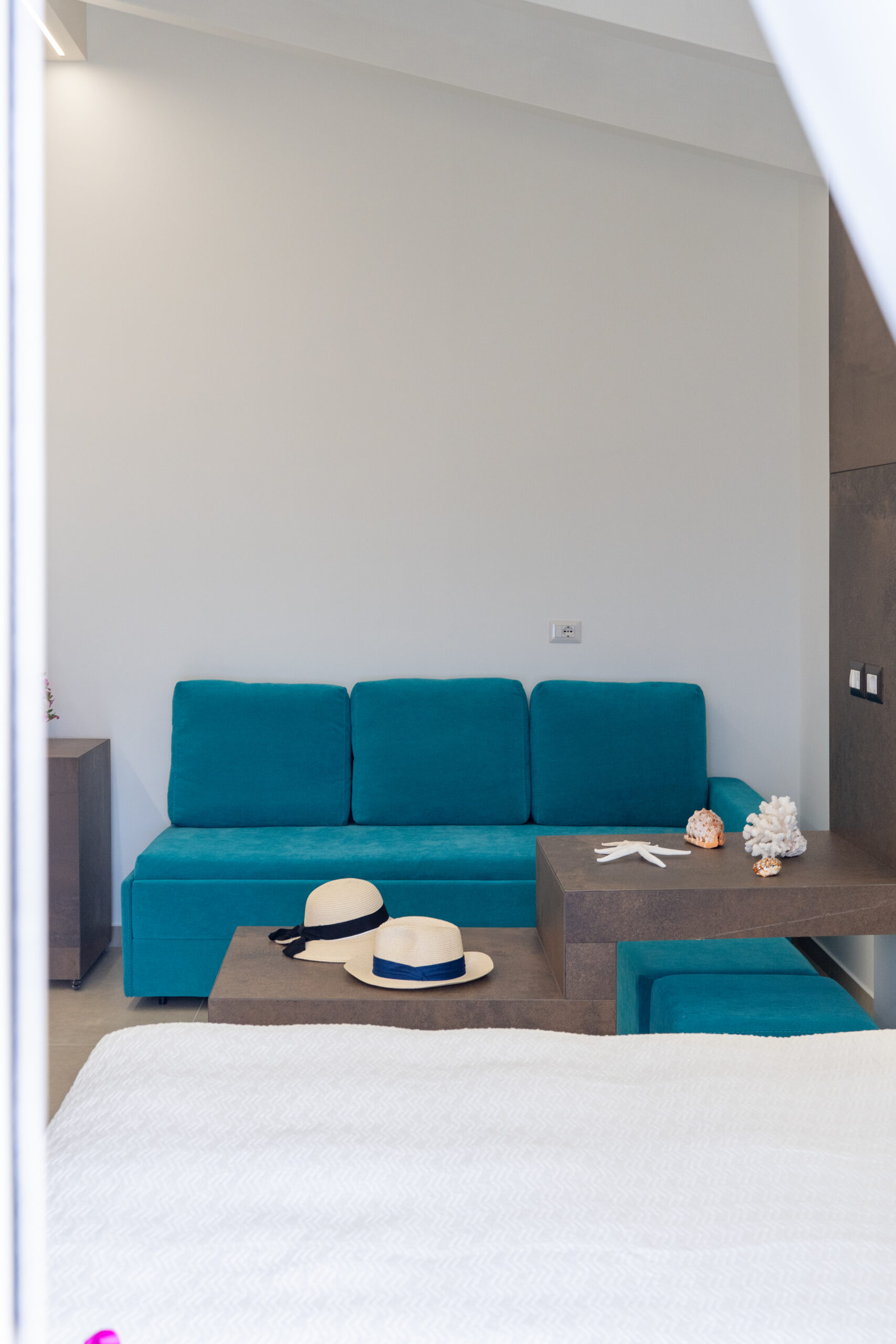 Junior Suite, con letto king size e divano letto a castello, zona giorno e vista mare